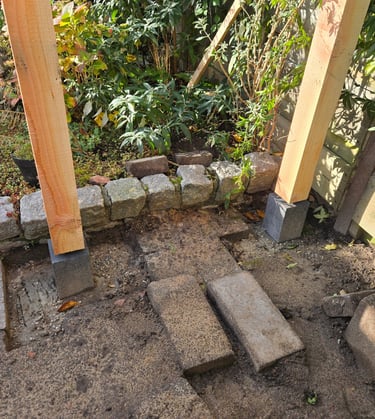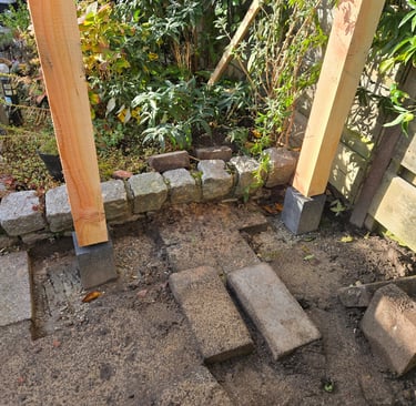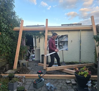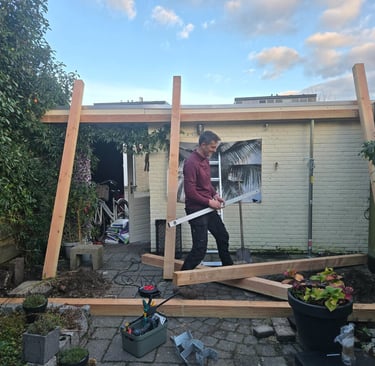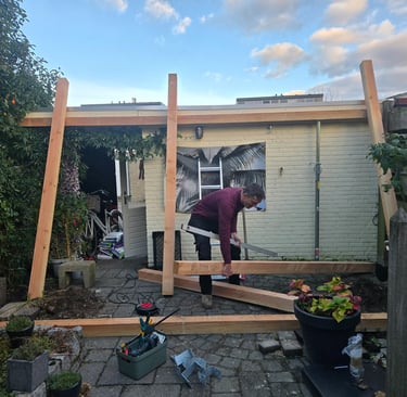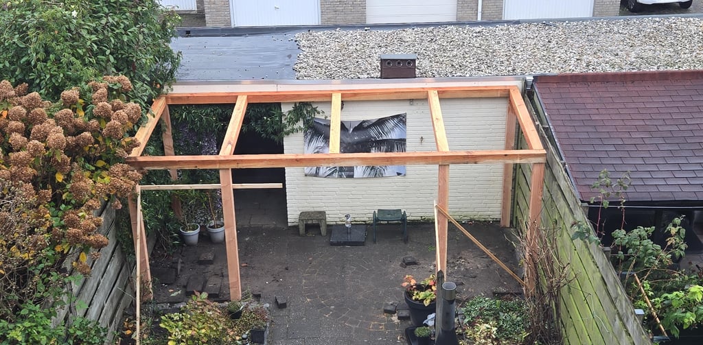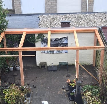 De bijna afgebouwde pergola, op maat, volgens het plan van onze klant